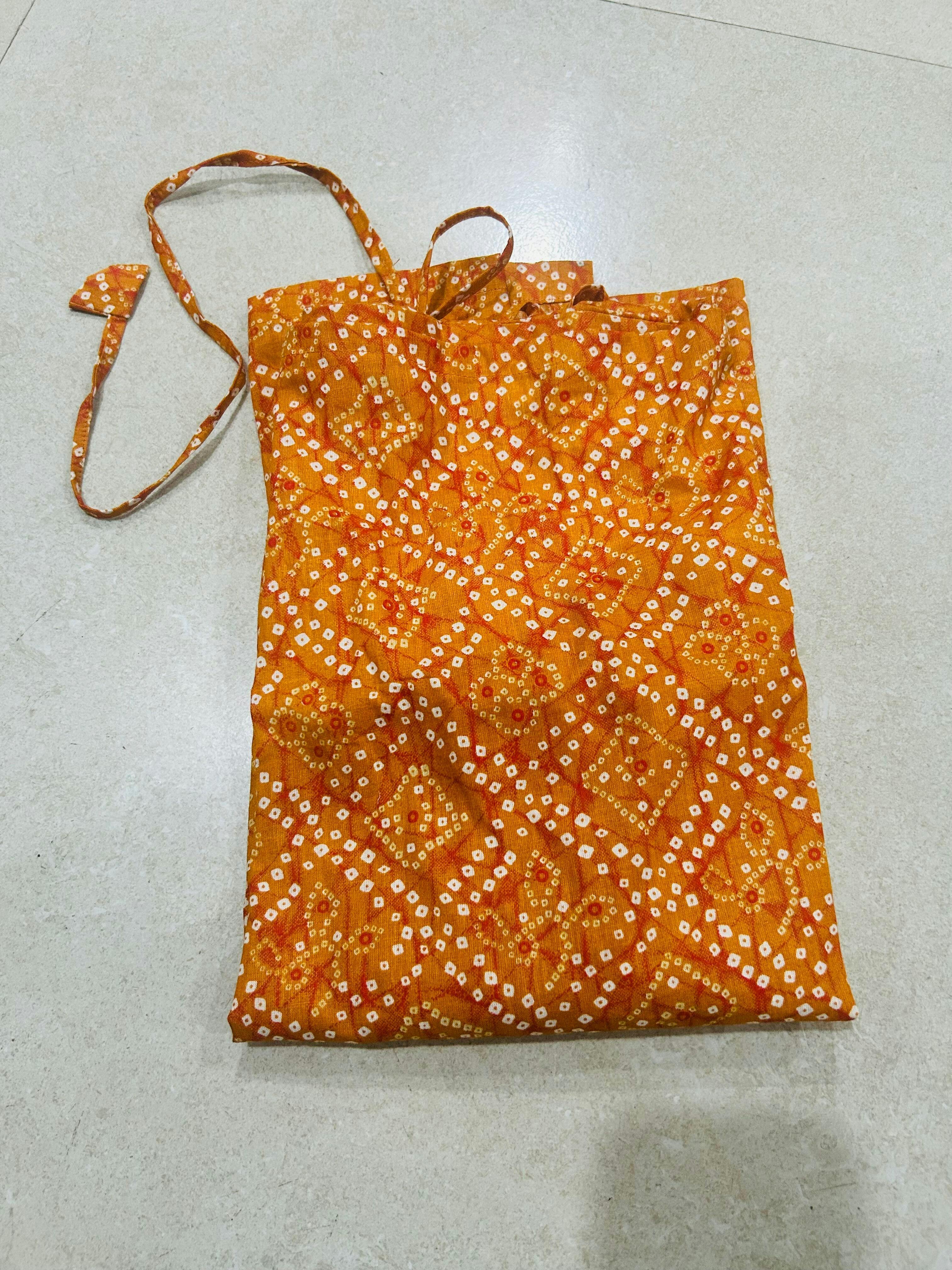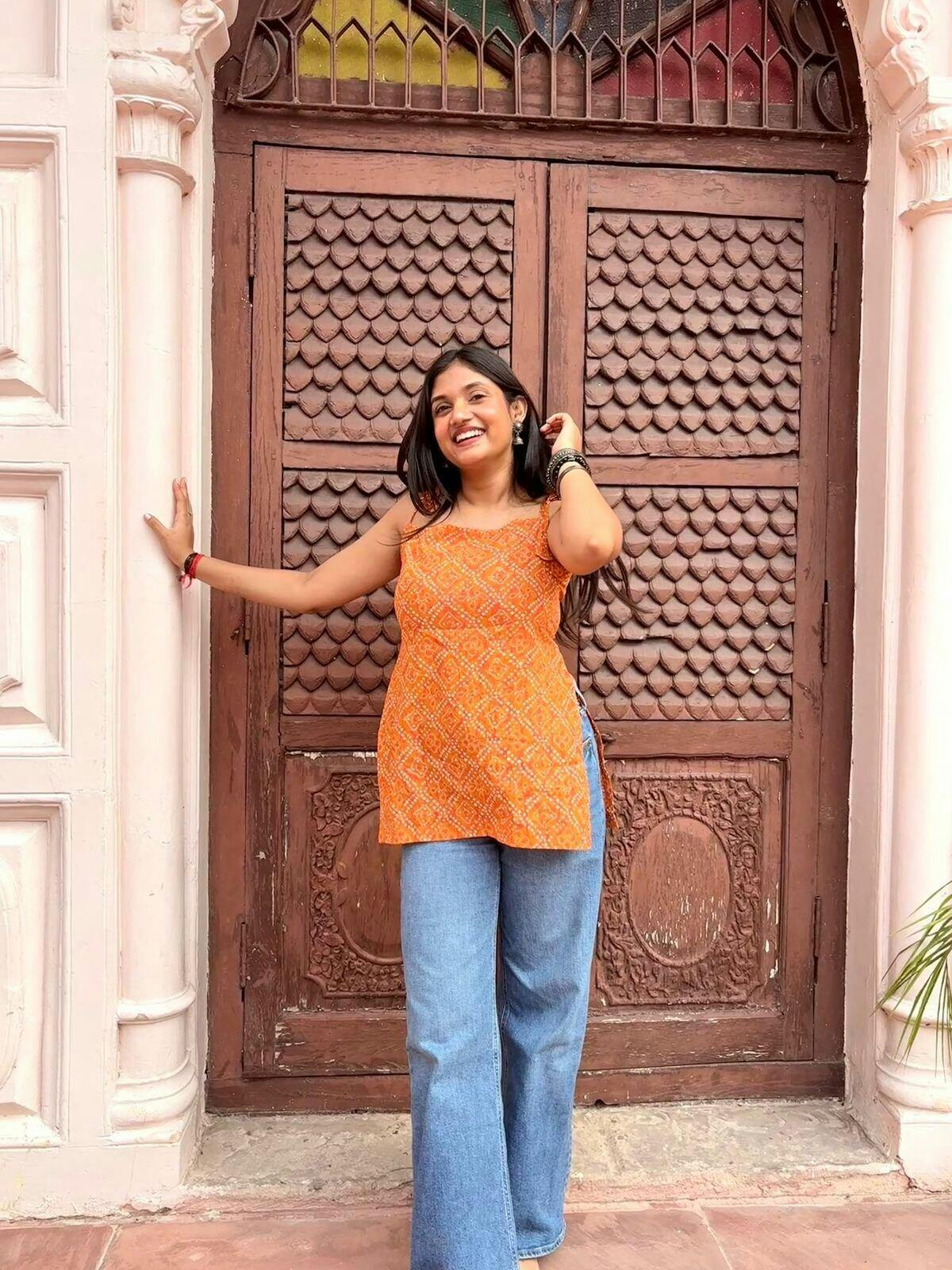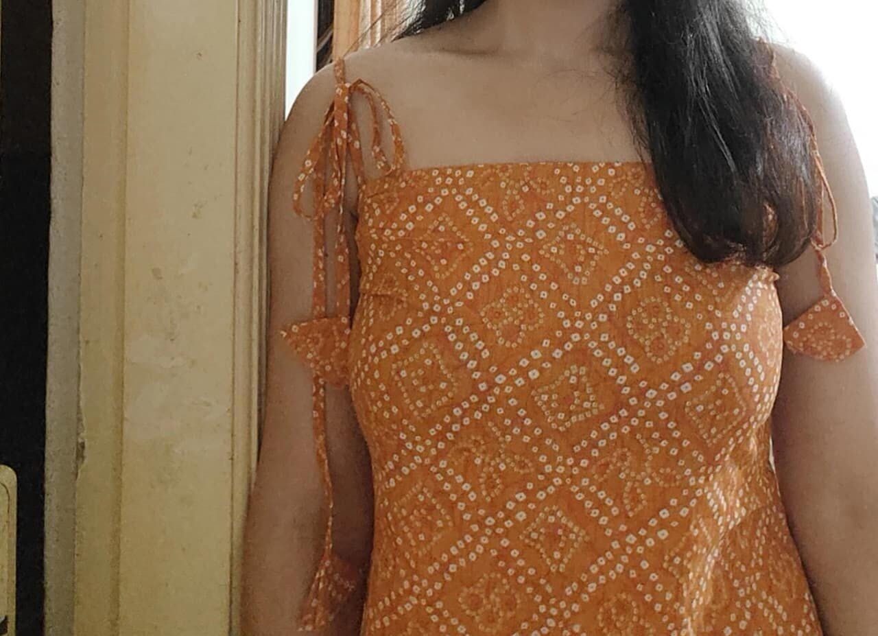 A yellow bandhani noodle-strap kurti with tie-up detail. Aafreen feels like sunlight on your skin as warm, free and rooted in tradition. With classic bandhani and a playful tie-up, it’s made for golden days and spirited hearts.