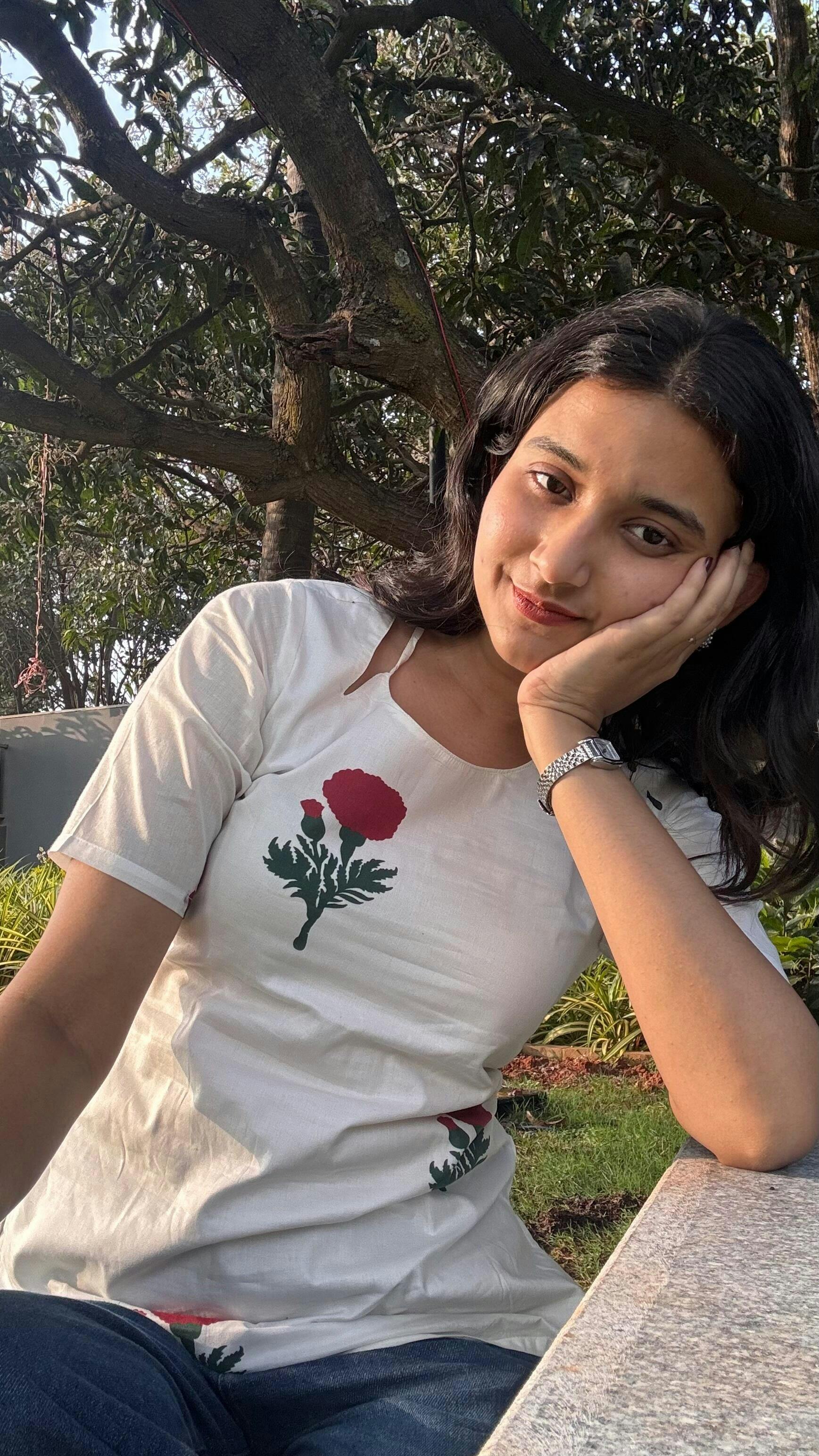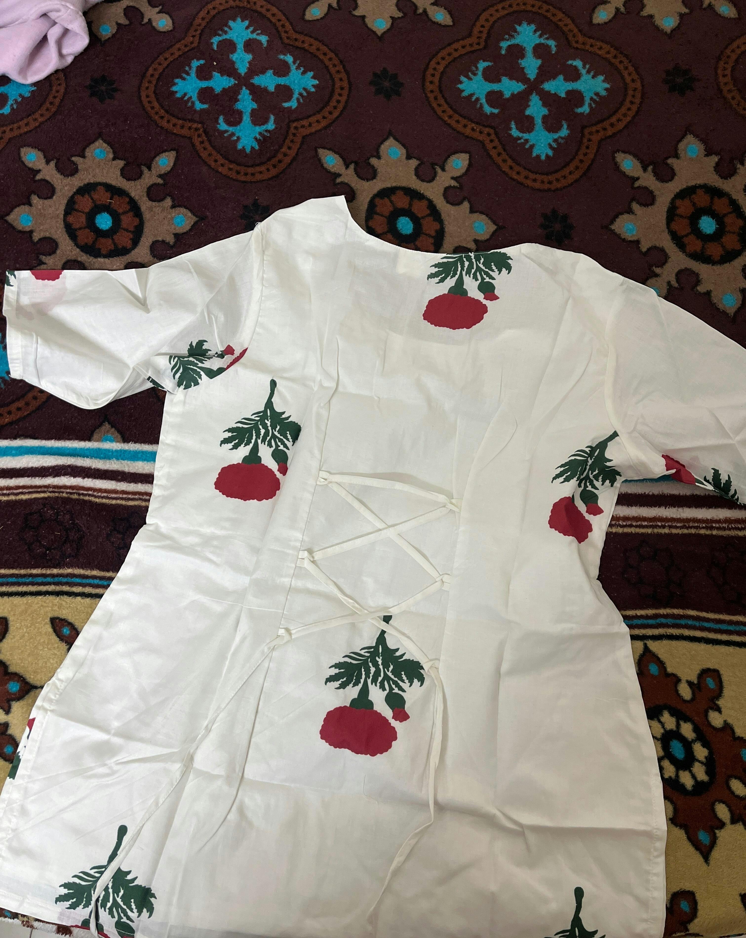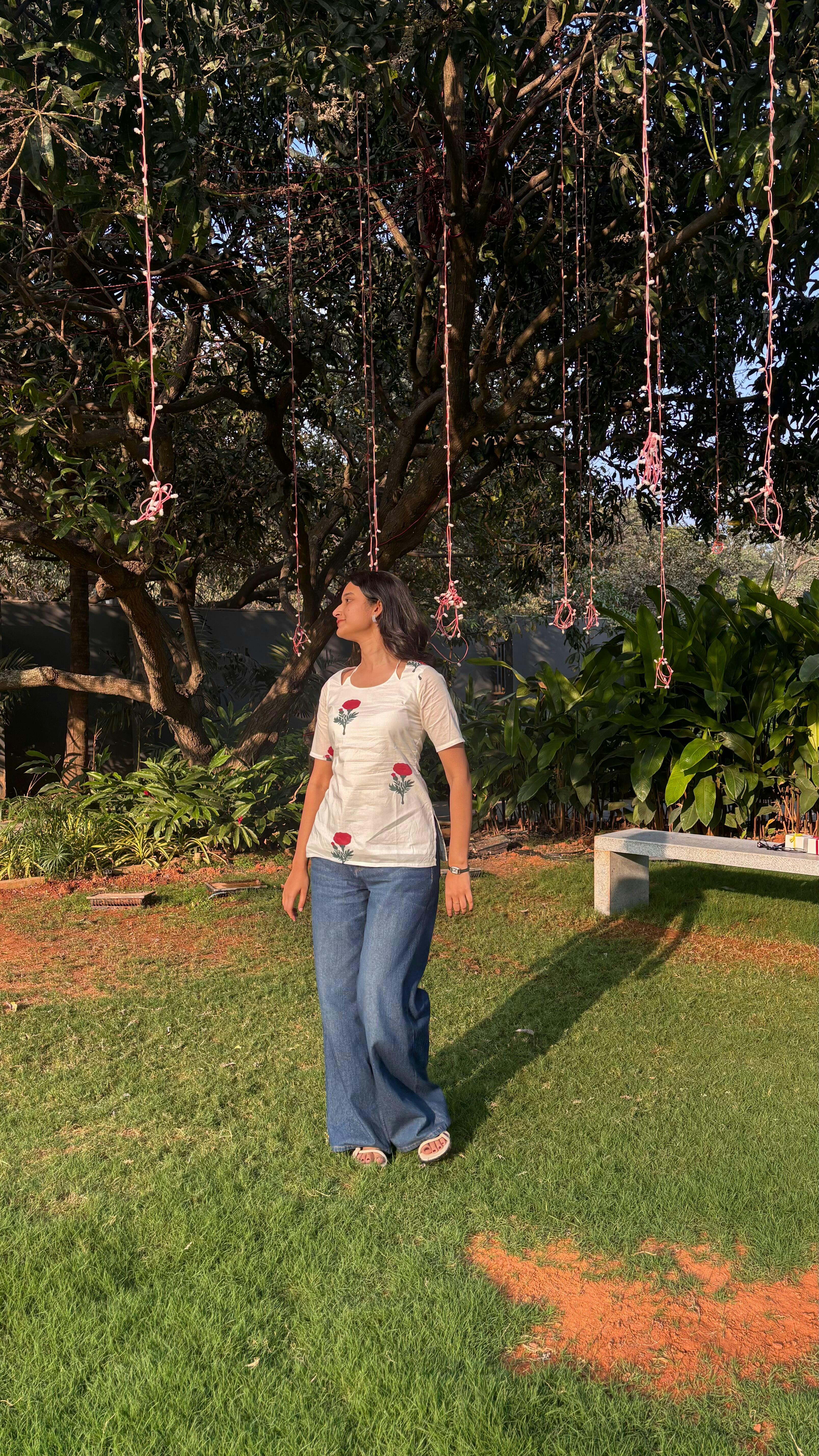 A white kurti with little red florals that feel almost hand-placed. Aaina is simple, familiar, and quietly beautiful like something you reach for without thinking twice. Easy to wear, easy to love, it’s made for regular days that don’t need dressing up, just comfort and a touch of grace.
