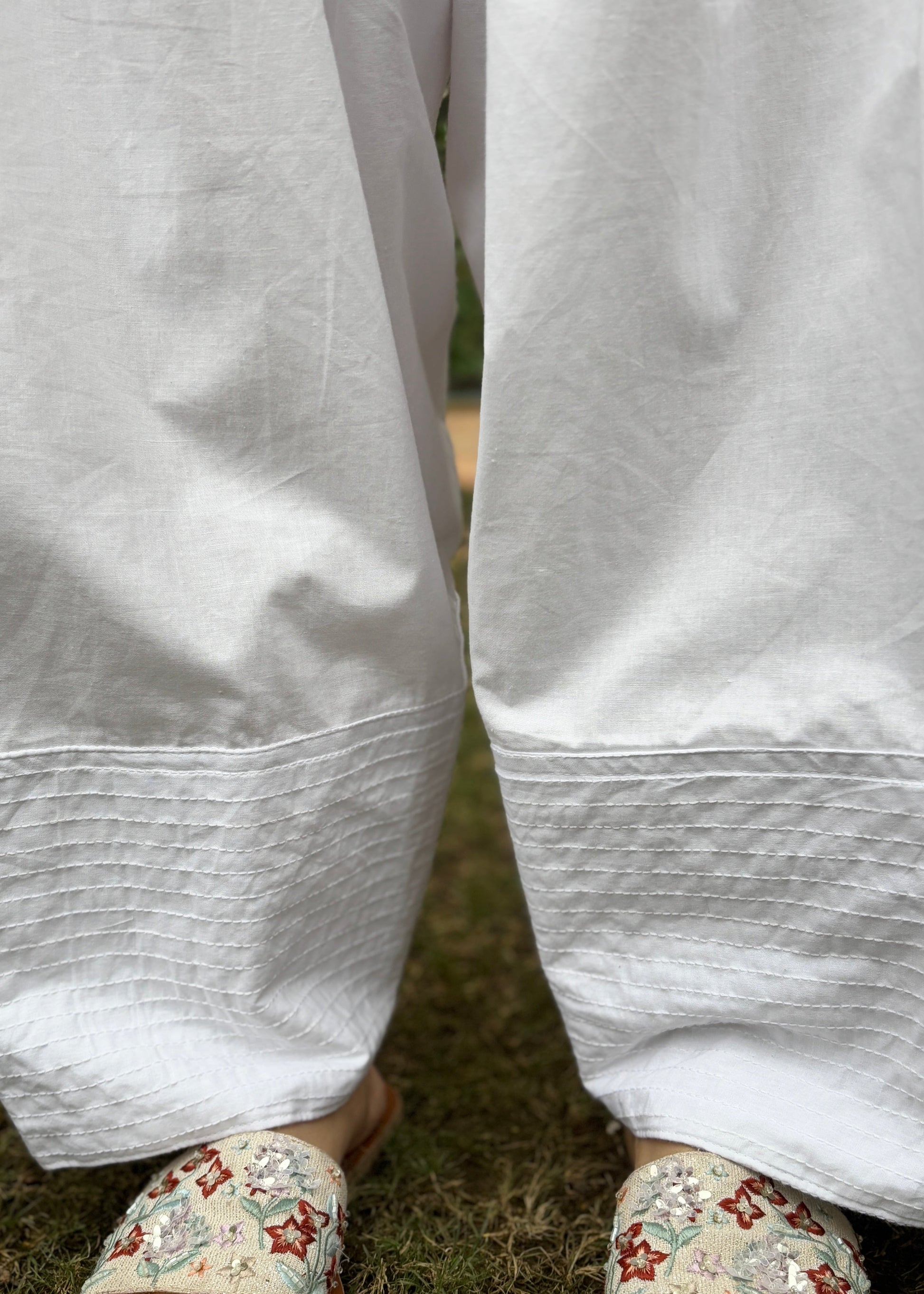 A timeless white farshi salwar with a graceful flare and thread work along the hem. Wide bottom hole ensures ease of movement along with elasticated waistband and slip-on closure.