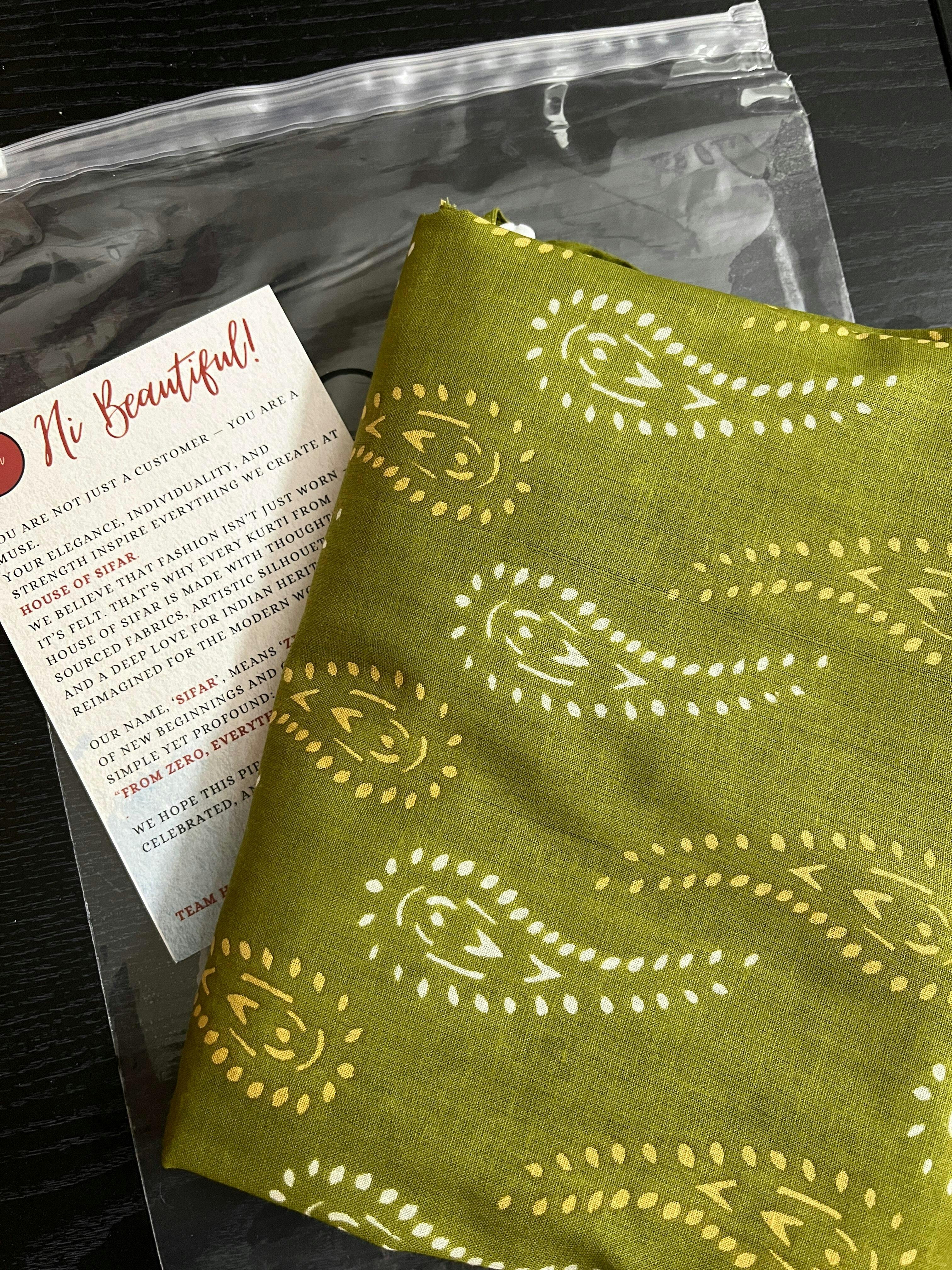 A kurti with delicate paisley prints and shell details on flared sleeves. Mehar feels like calm after the rain — grounded, graceful and effortlessly alive. With its earthy hue and subtle flow, it’s made for days that call for quiet confidence and understated charm.